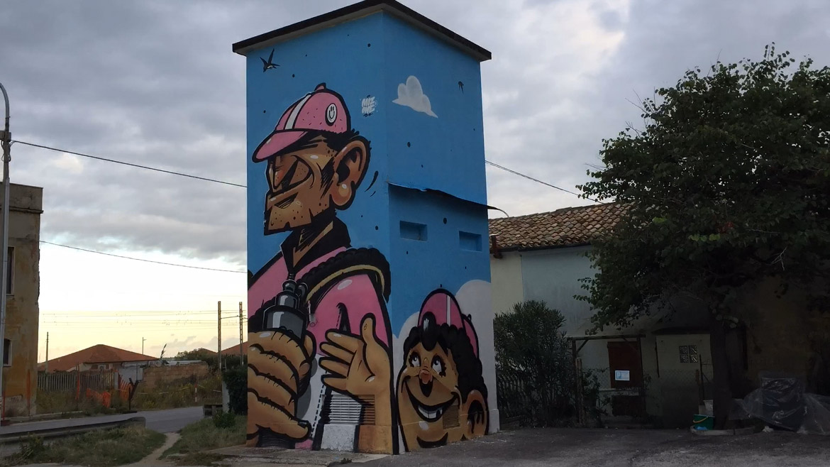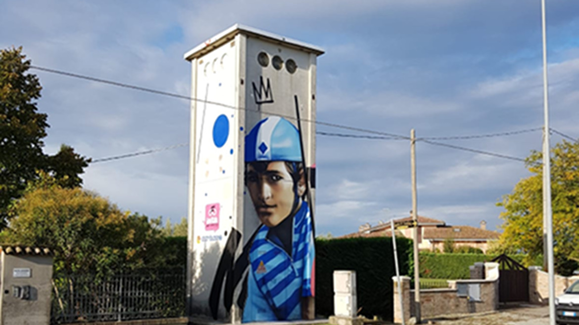 Tra le opere proposte da writers di fama nazionale e internazionale, un omaggio all’indimenticabile Marco Pantani nell’opera realizzata da Mozone e una citazione del mitico passaggio della borraccia tra Coppi e Bartali nella creazione di Mr. Wany, un’immagine simbolo di sport e solidarietà.