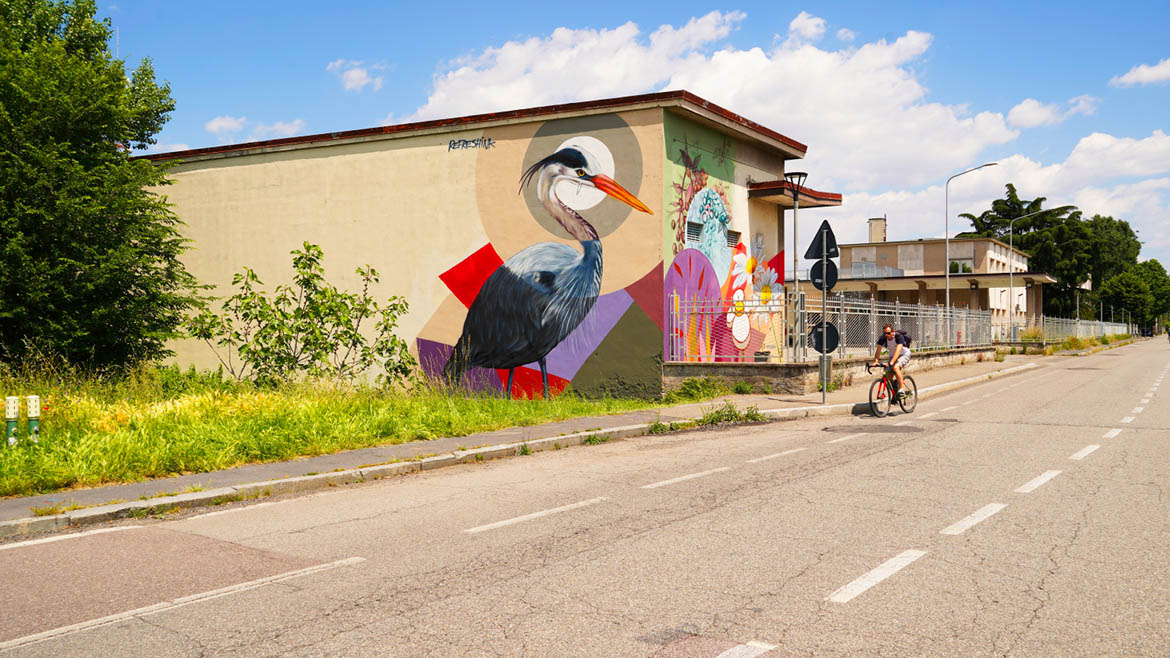 Andando in chiusura del Giro, nella tappa 21, Senago-Milano TISSOT ITT, nel capoluogo lombardo, nella cabina “Vimodrone”, REFRESHINK, autore con all’attivo partecipazioni a festival anche internazionali, nell’artwork “Airone della Martesana” si è focalizzato sui temi del cicloturismo sostenibile e del rispetto dell’ambiente. Al centro è stato raffigurato il volatile, con la sua “aureola luminosa”, esaltato nella sua appartenenza “sacra” all’ecosistema, mentre osserva e cura il corso d’acqua.
