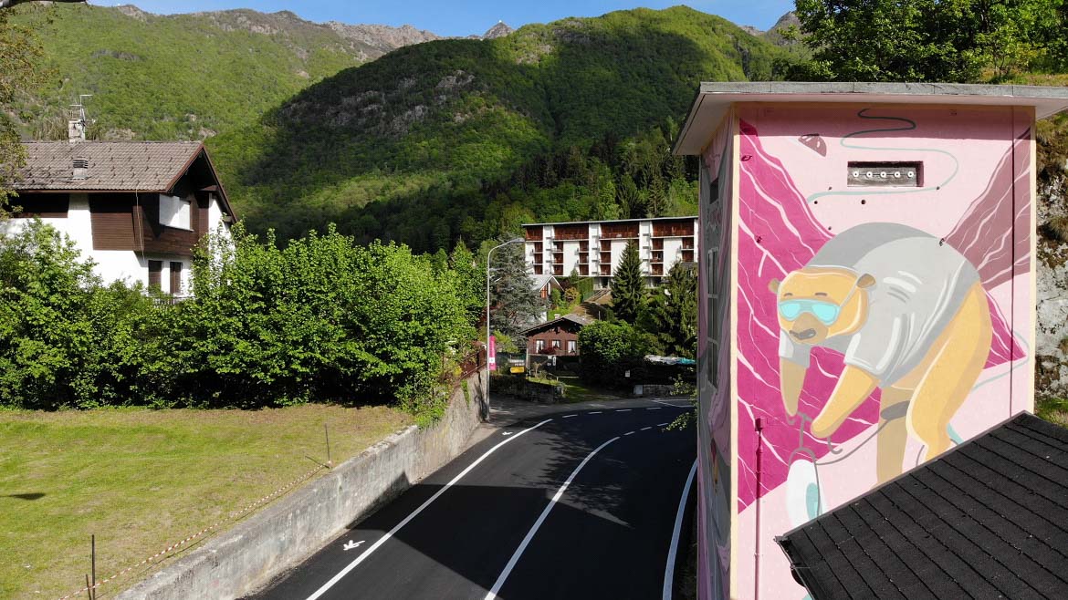 Per la tappa 19, Abbiategrasso - Alpe di Mera, è stata la volta della cabina “Centro” a Scopello (Vercelli), dove RAME13, artista toscana sensibile ai temi della sostenibilità ambientale e sociale, in “Bearoads” ha voluto rendere protagonista della gara ciclistica un orso, libero di correre e andare verso la vetta, per esprimere in maniera anticonvenzionale il bisogno, sempre più importante, di ascoltare la Terra, di proteggerla e curarla.