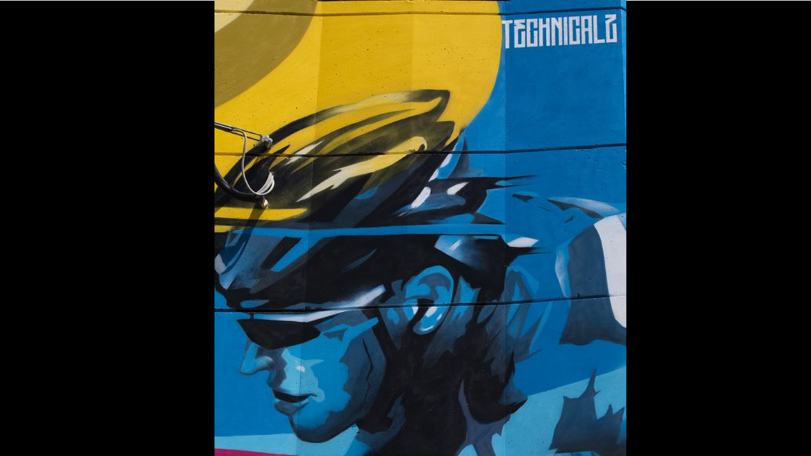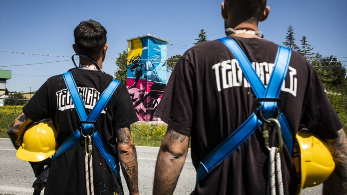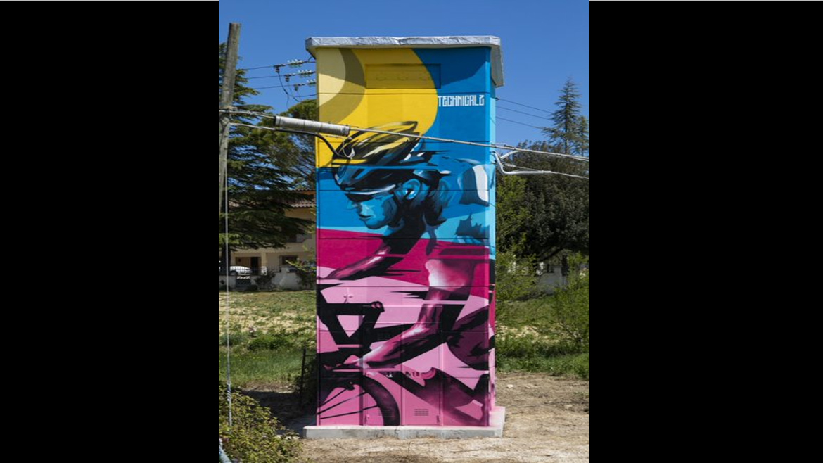 Questo progetto si distingue per la sua forza e dinamicità. Essendo la cabina all’inizio di una salita, i ciclisti (e chi percorrerà la strada in quella direzione) avranno proprio l’impressione che lo sportivo dipinto si muova con loro, ruotando attorno alla cabina, il ciclista ruota con lo spettatore, creando interazione e continuità. Non è stato raffigurato un semplice ritratto, ma piuttosto l’essenza del ciclismo, in forma eterea, ma allo stesso tempo potente. Lo sfondo, anche questo grafico, con uno stile che potrebbe richiamare il futurismo, è composto da tre macro zone: il sole, il cielo, ed il paesaggio. La composizione si basa tutta sui colori primari (Ciano, Magenta e Giallo). Il murales è anche un omaggio (velato) a Michele Scarponi, il cielo ed il sole sono formati da azzurro e giallo (i colori del suo team) ed è stata inserita un’aquila che vola lontana, in onore proprio di Michele, soprannominato “aquila”. Il paesaggio, e le tonalità del magenta, si rifanno ovviamente al concetto di “Maglia Rosa”.