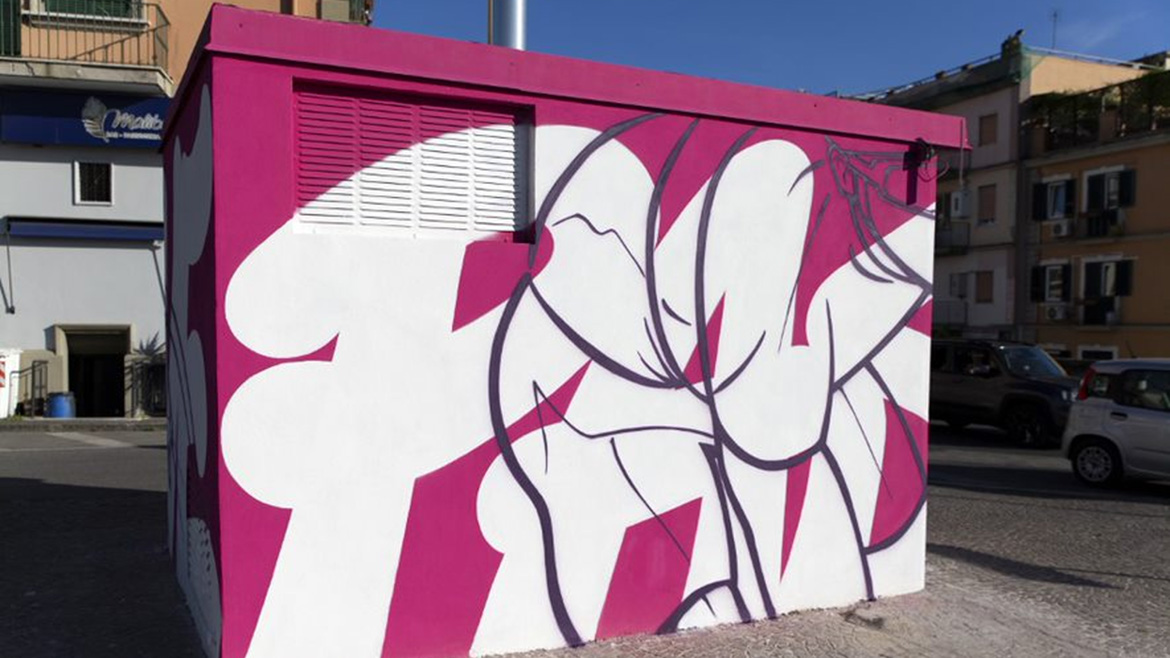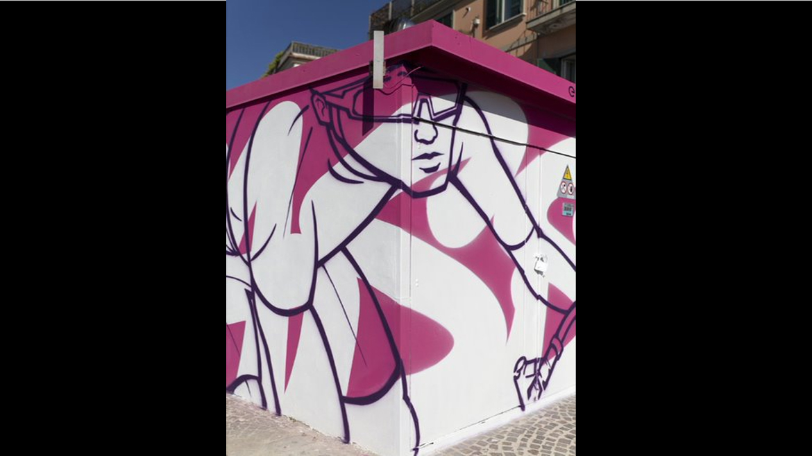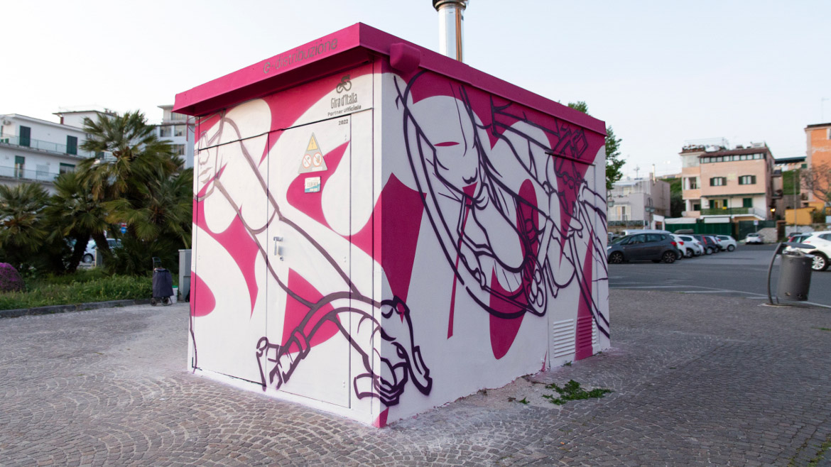 E-Distribuzione e il Giro d’Italia, due realtà con radici profondamente radicate nel tessuto sociale e culturale del nostro paese. Entrambe trasmettono Energia e Passione attraverso tutta la penisola, un percorso che le ha portate a diventare parte integrante della vita quotidiana degli italiani. Proprio da questi due elementi comuni nasce l’artwork che ha creato un legame tra parola e immagine, usando la parola Passione alla quale sono stati associati, oltre all’ immagine delle gambe, motore che crea energia, anche la testa e il cuore dei ciclisti, capaci di creare e gestire la passione. Nell’opera non manca il colore rosa, prendendo spunto dalla mitica maglia simbolo del primato in classifica del Giro d’Italia e per comunicare in modo più semplice ed immediato con le persone è stata realizzata una grande scritta che attraversa in tutta la sua lunghezza la superficie del muro.