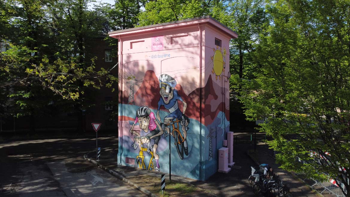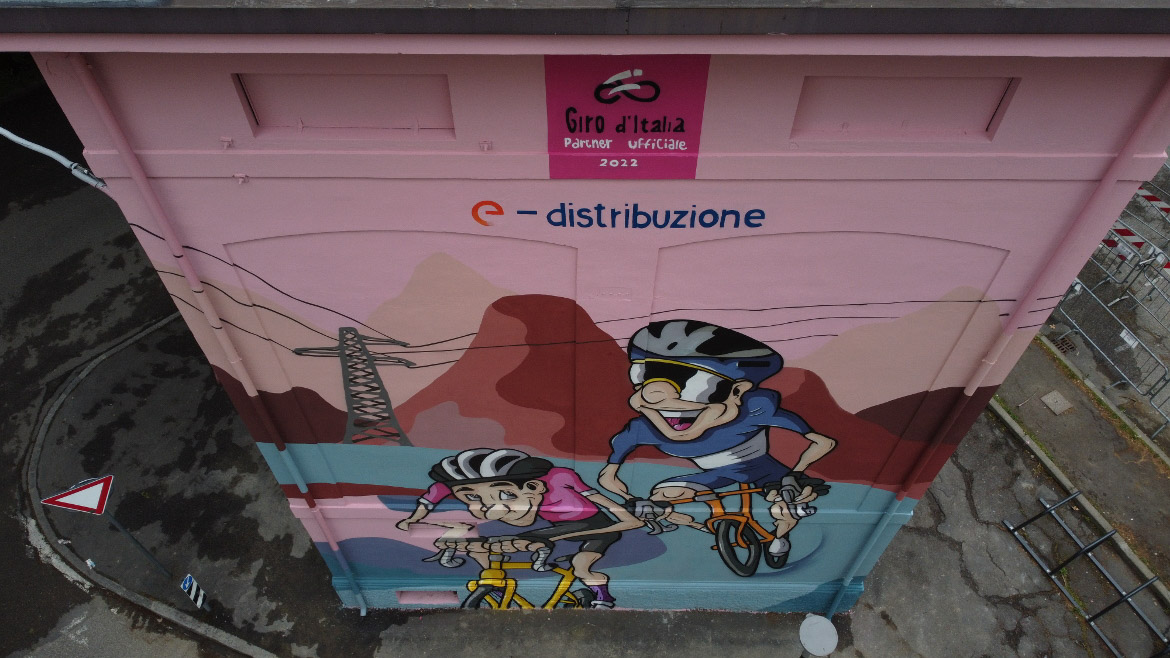 La rappresentazione grafica della varietà paesaggistica italiana, passando dalle montagne alle colline e concludendosi sul mare, si tinge di rosa e riesce a trasmettere l’impegno di E-Distribuzione nel raggiungere anche quei luoghi e ambienti più isolati e difficili da servire attraverso la fornitura di energia elettrica. Le caricature dei ciclisti esprimono in modo ironico dinamicità ed “energia” invitando lo spettatore ad usufruire delle due ruote come mezzo di trasposto ecosostenibile.