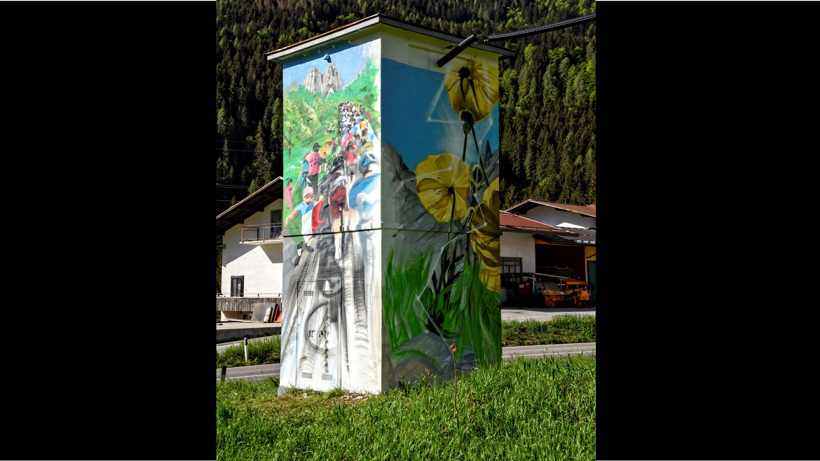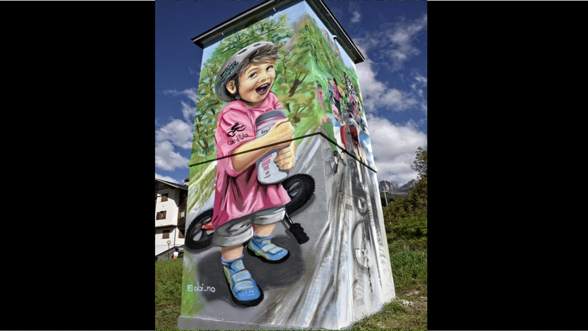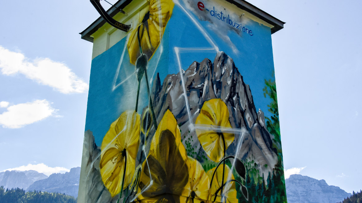 L’artwork è una celebrazione delle Dolomiti. Le due facciate esaltano il paesaggio alpino tipico con il papaver alpinum, specie endemica delle zone, in grado di crescere anche sulla nuda roccia e resiliente come un atleta da Maglia Rosa. Il giallo dei papaveri, la spettacolare luce delle Dolomiti, unica al mondo, richiamano la fluorescenza della rete di energia, rappresentata da fasci di luce bianchi che si sovrappongono al paesaggio, e che iconograficamente simboleggiano la capillarità del servizio di rete di fornitura elettrica nazionale. Sulle altre due facciate un bambino in primo piano spicca tra la folla e i ciclisti: il piccolo tifoso è emozionato a bordo strada, felice per aver appena visto passare il Giro e aver ricevuto una borraccia direttamente dalle mani di uno dei suoi beniamini.