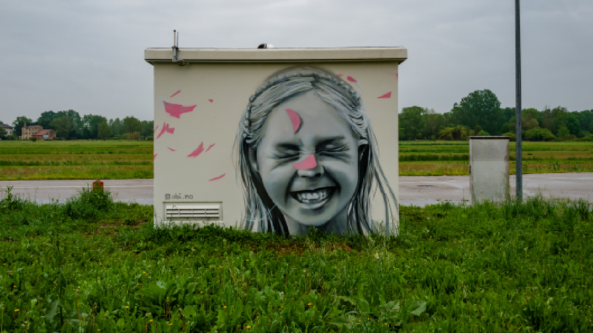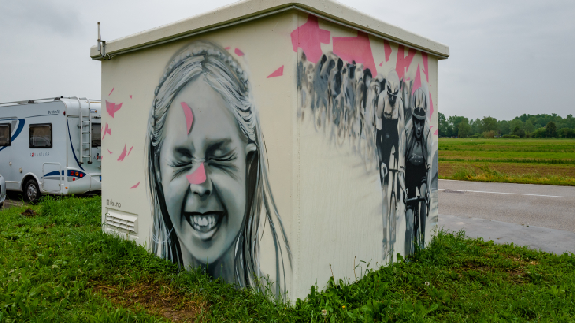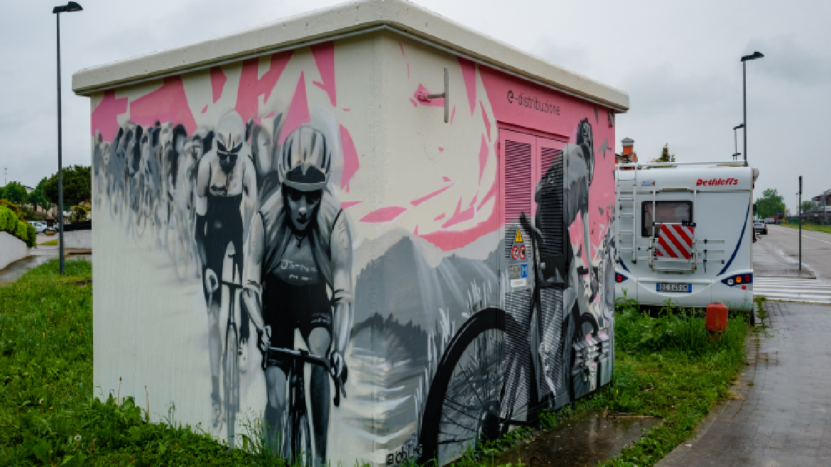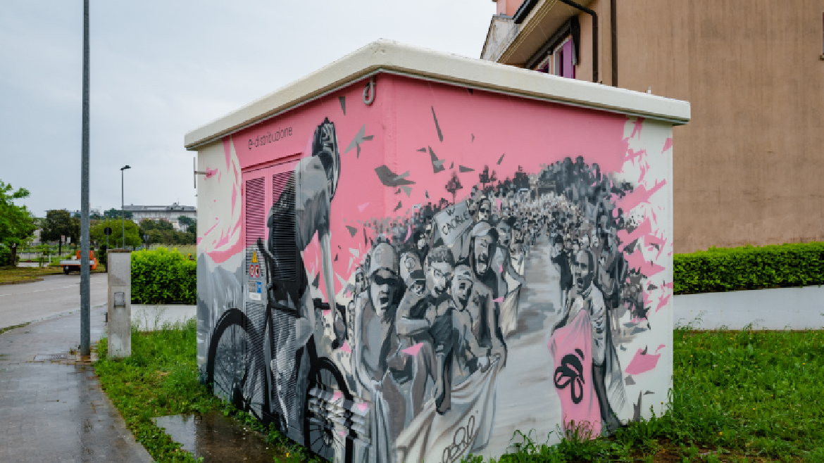 La prima proposta vuole raccontare il Giro attraverso la rappresentazione delle tre principali vedute “in soggettiva” della gara ciclistica: si susseguono sulle tre facciate l’immagine in campo lungo del gruppetto degli inseguitori che l’occhio del ciclista in fuga coglie dietro di se mentre scatta, il fermo-immagine della maglia rosa che lo spettatore da bordo strada riesce a catturare mentre il campione è nel proprio campo visivo per una frazione di secondo - immagine che conserverà come ricordo indelebile - e il primo piano dei tifosi che si assiepano attorno, catturato dall’occhio del ciclista che conduce la tappa. Le linee che tracciano il legame anche simbolico tra le tre inquadrature rappresentano graficamente i campi di forza che si uniscono per generare energia: la rete di distribuzione dell’energia diventa metafora dell’energia sportiva che si sprigiona nella potente connessione tra atleta, contendenti e pubblico, uniti dalla partecipazione ad un evento di enorme potere evocativo. Sull’ultima facciata una bambina ride felice per essere lei stessa parte di questa festa che è vincere, partecipare, esserci.