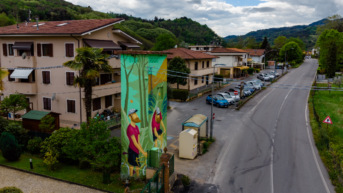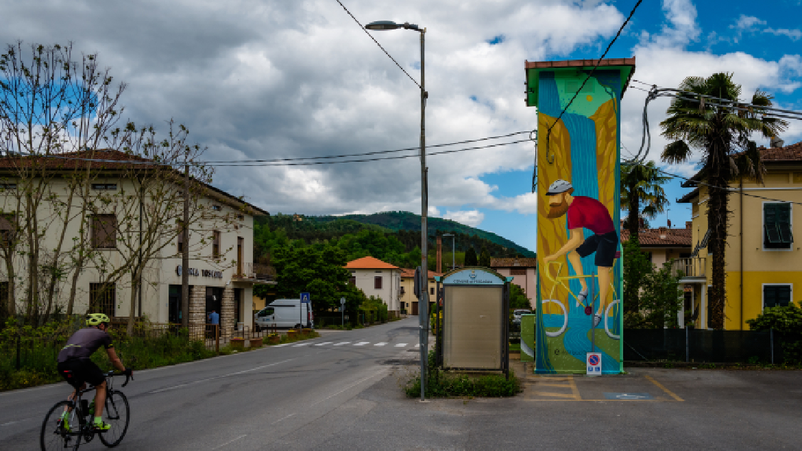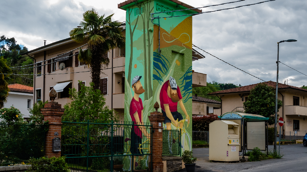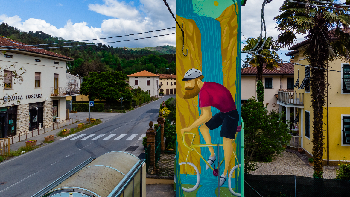 L'opera raffigura un ciclista immerso nel verde toscano. Quest'anno il Giro d'Italia passerà proprio nella mia terra natia e ho voluto rendere omaggio ai paesaggi che la compongono. Nelle tre facciate della torretta vediamo un atleta che s'immerge nel verde Toscano e ne contempla la sua bellezza, perchè la bici non è solo uno sport ma un modo di vivere. Chi sceglie di andare in bici, sceglie la sostenibilità, la fatica che tonifica lo spirito, il rispetto.