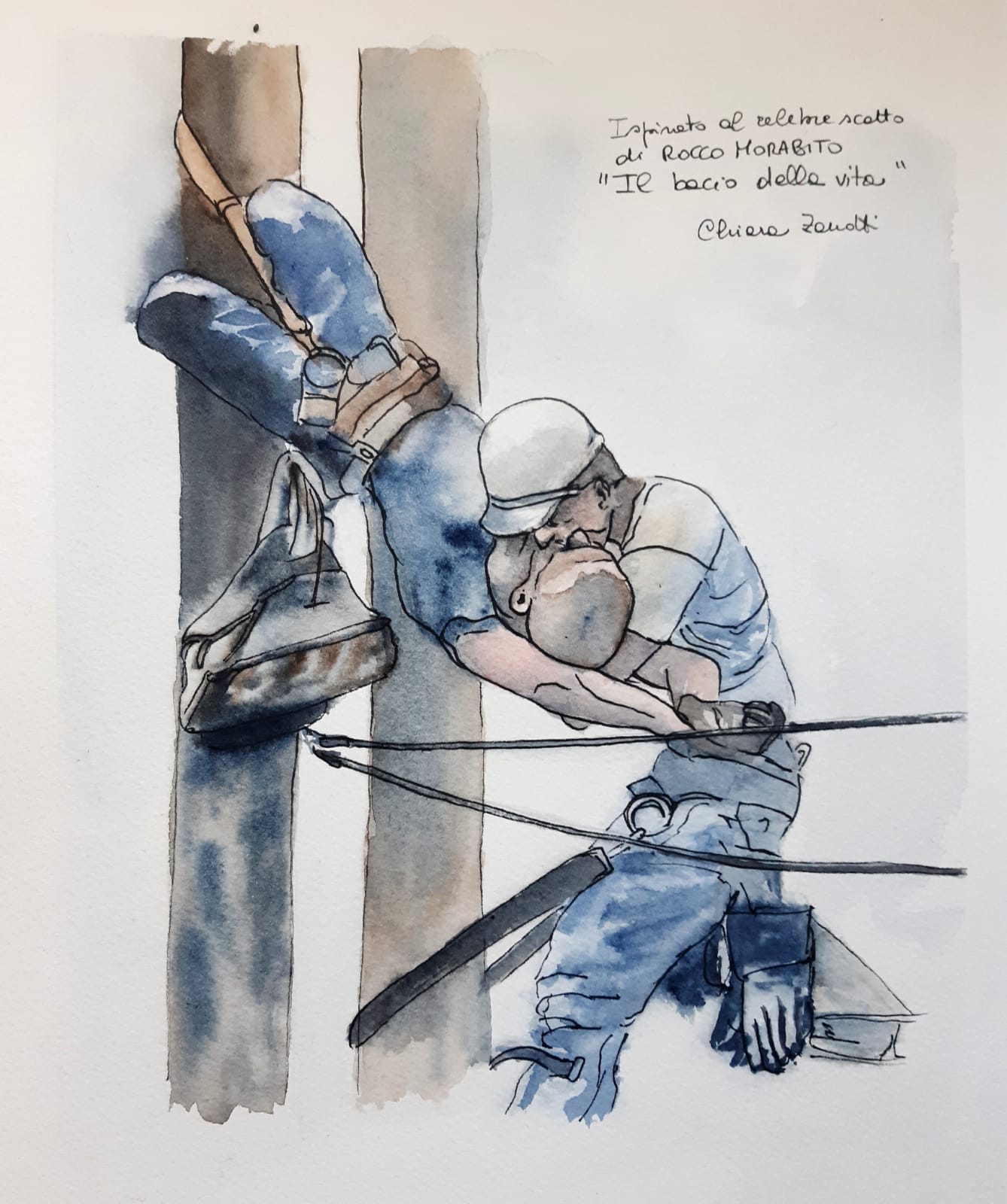 Soprannominata “La Miss”, Chiara Zanotti, 52 anni, ha come motto di vita “La calma è la virtù dei forti”. Specialista in pianificazione di rete a Bologna, città di cui è originaria, lavora per E-Distribuzione da 31 anni. I suoi hobby sono la pittura e il disegno. Per noi ha realizzato “Il bacio della vita”, titolo ripreso dalla fotografia di Rocco Morabito che ha cercato di tradurre in acquerello calandolo nella realtà di E-Distribuzione e portando un messaggio preciso: “Un buddy ti può salvare la vita”.