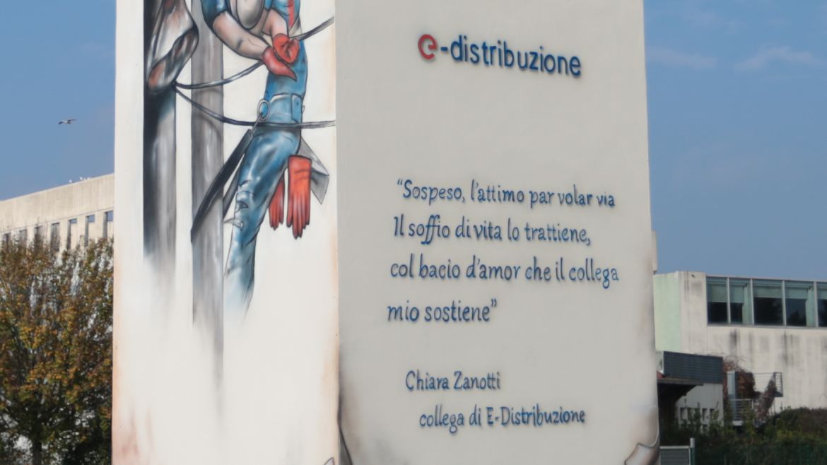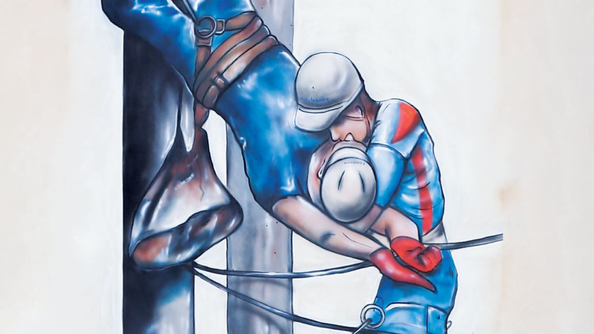 Un operativo sospeso viene sorretto grazie all’intervento di un collega, che lo tiene in vita grazie a una manovra salvavita. Nell’opera realizzata da Diego Montagner, la sicurezza è raffigurata attraverso un’immagine intensa, che coglie l’attimo stesso in cui il soffio della vita viene trattenuto, nel suo fuggire, dalla lucida prontezza di intervento del collega. Un buddy ti può salvare la vita!
