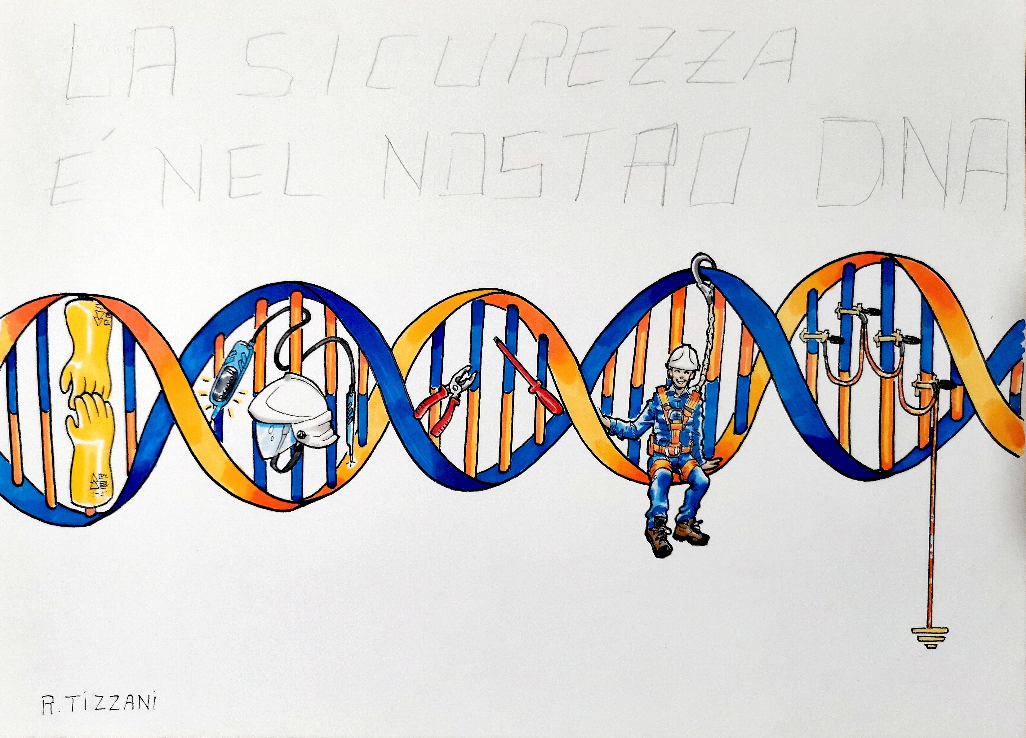 Raffaele Tizzani è in E-Distribuzione da più di 8 anni e attualmente è addetto safety nella sede di Napoli, città dove è nato e cresciuto. 32 anni, soprannominato “L’artista”, Raffaele è appassionato di pittura, disegno, fotografia e fai da te. “Be water” di Bruce Lee è il suo slogan, inteso come “avere la capacità di adattarsi a qualsiasi ostacolo o problema si possa presentare”. “La sicurezza è parte di noi” è il suo bozzetto che vuole raccontarci che la sicurezza è parte del DNA di E-Distribuzione.