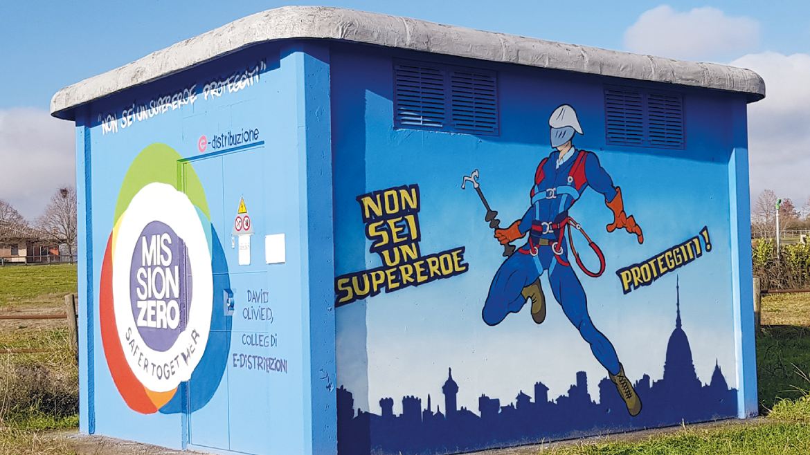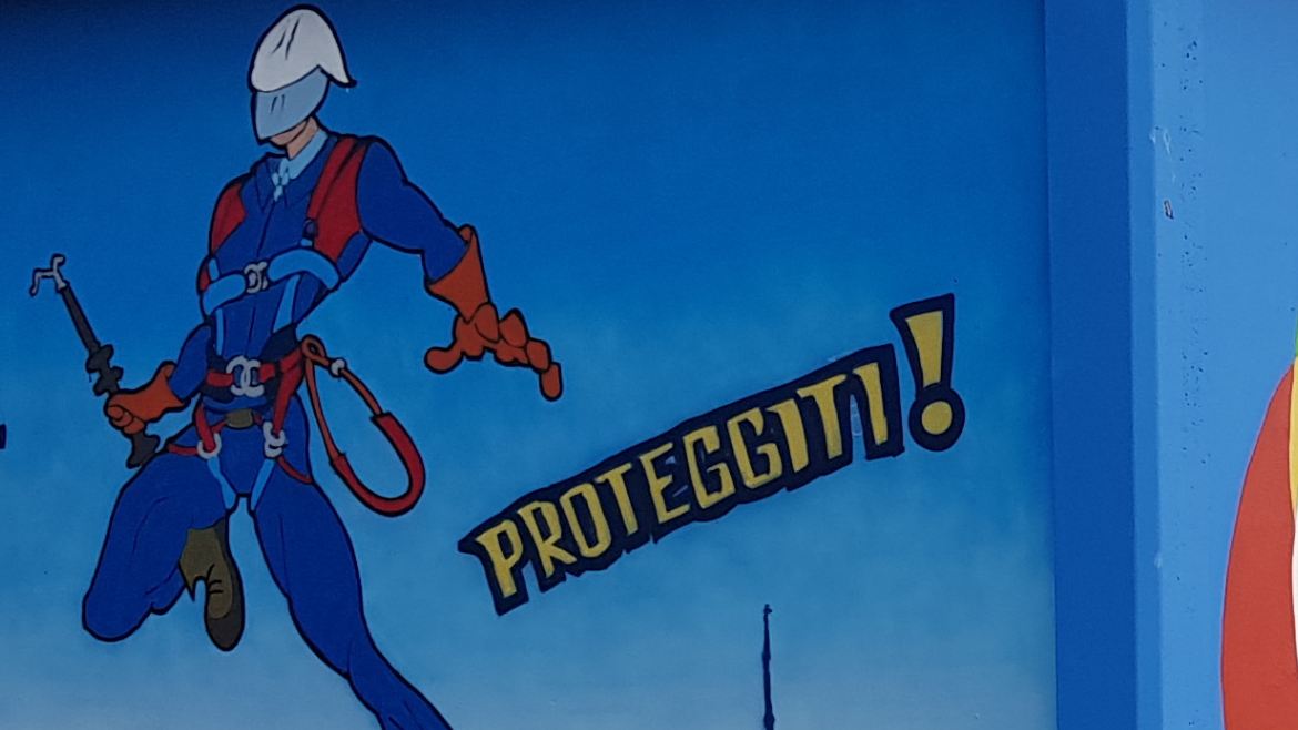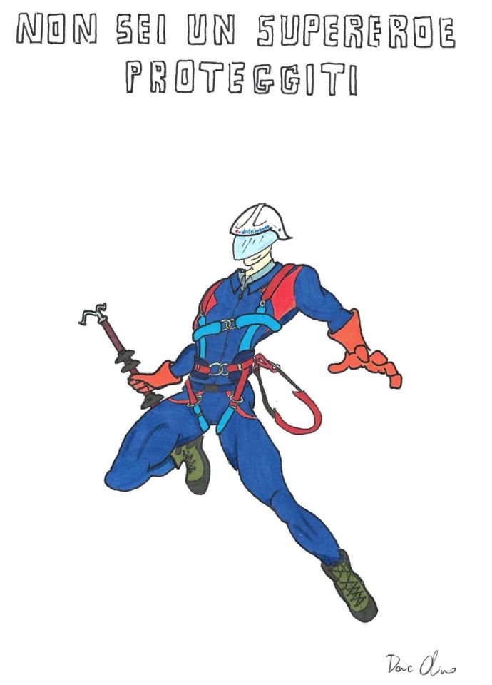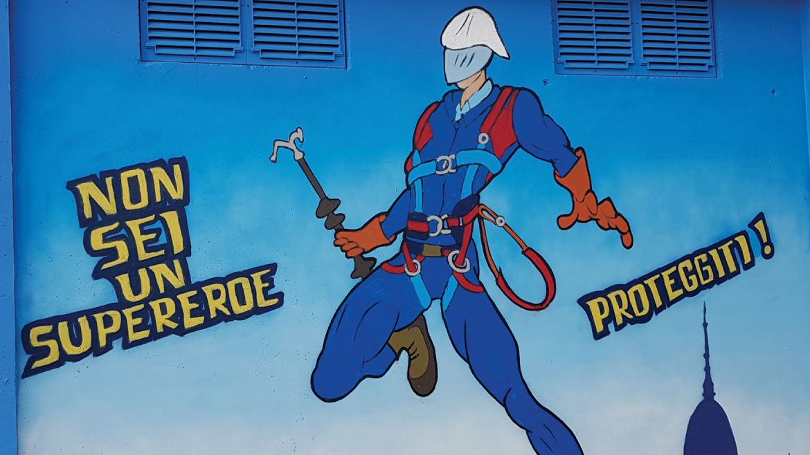 Guanti, imbragatura, casco e scarpe antinfortunistiche indossati da una figura che rimanda a un supereroe: nell’opera, i Dispositivi di Protezione Individuale sono al centro, e il messaggio è chiaro: siamo esseri umani e proteggersi è fondamentale, sempre.