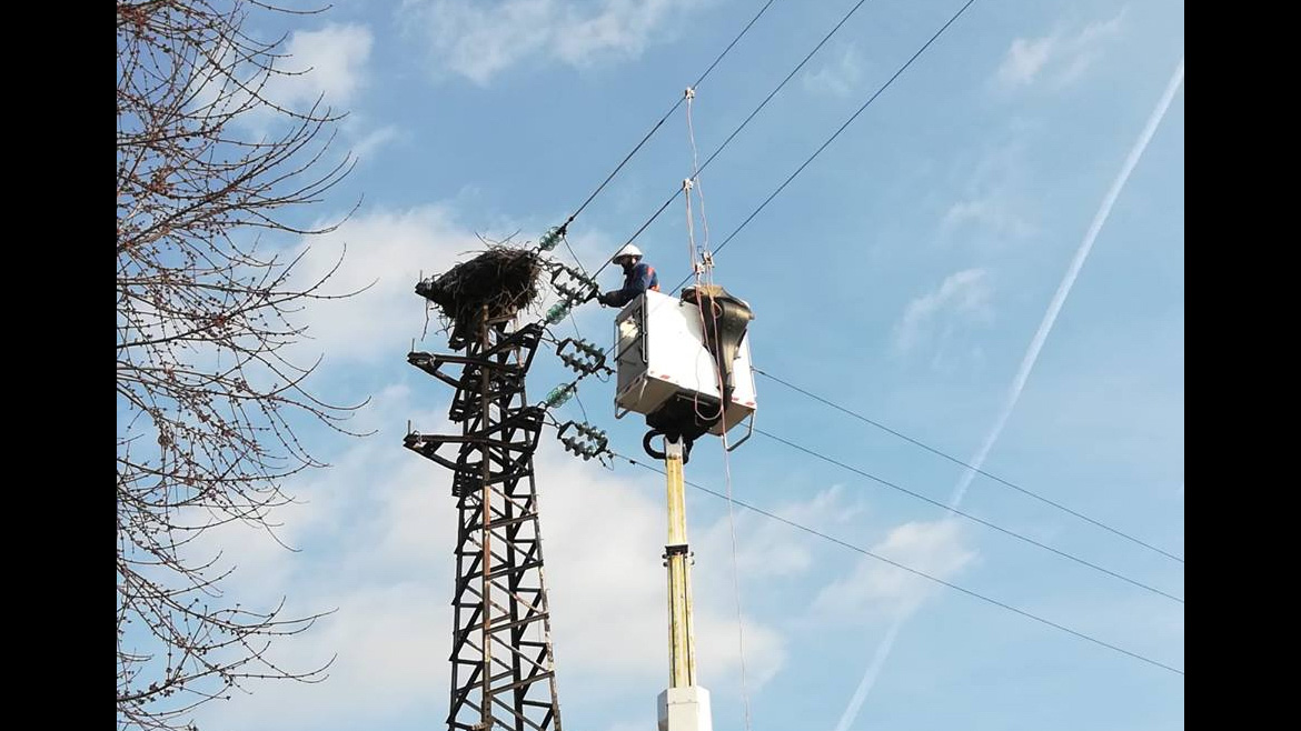 I tecnici di e-distribuzione mettono al sicuro il nido delle cicogne.