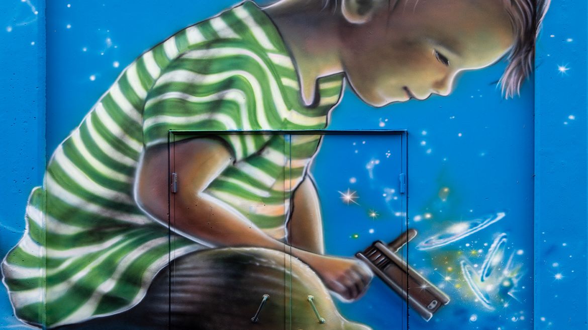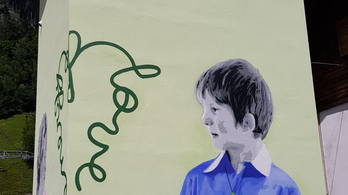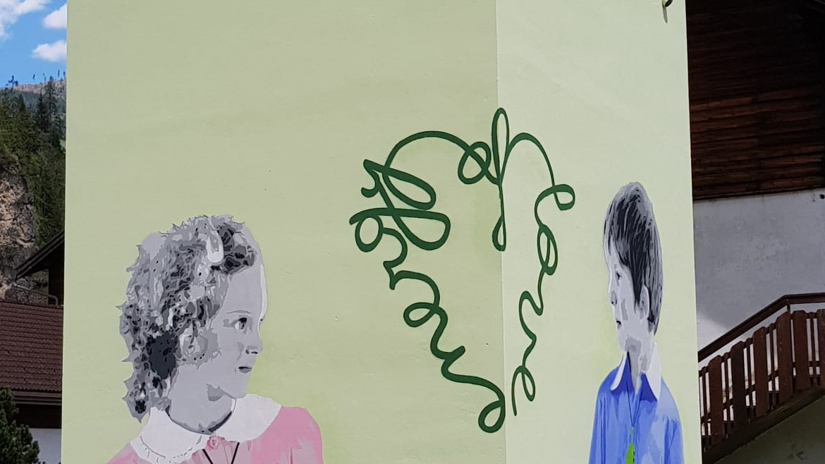 Su due pareti sono illustrati un bambino e una bambina, uniti da una collana di pini, elemento tipico del bellunese, che rappresenta la forza per un impegno comune per vivere e realizzare un mondo migliore.