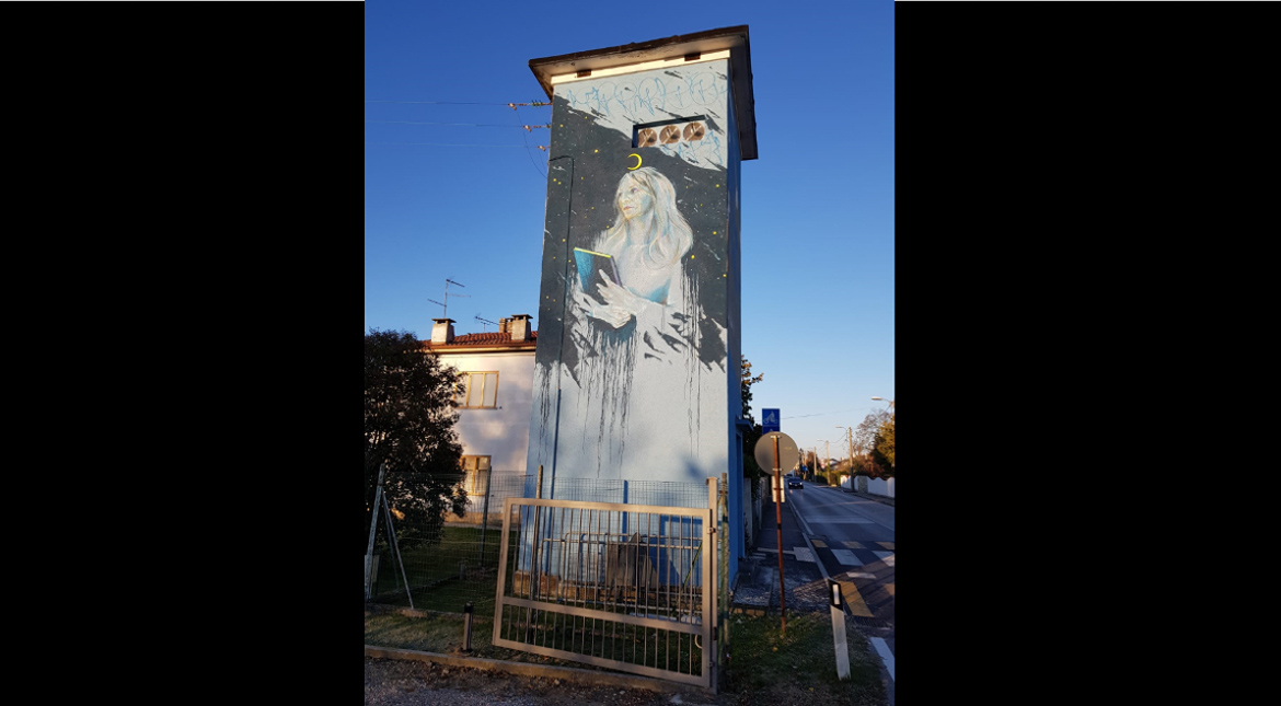 Alla violenza non si può reagire che con l’amore, anzi “mettendo l’amore sopra ogni cosa” come cantava De Andrè in “Bocca di Rosa”. E al verso della celebre canzone è dedicata un’altra nostra cabina, a Turriaco, sempre in Friuli Venezia Giulia che è stata svelata oggi. Quello che viene raffigurato è l’amore che si basa sui valori del rispetto, delle pari opportunità e dell’uguaglianza dei diritti, sopra ogni cosa, appunto. L’opera pittorica ha come protagonista una signora che si staglia su uno sfondo stellato. Il muro rivolto a est la raffigura con un libro chiuso a sottolinearne la bellezza, appunto, celata e da scoprire. Il muro rivolto a ovest la ritrae invece con un libro aperto, le cui pagine si fondono con il cosmo svelandone la complessità e la profondità, a sottolineare che la donna non può essere definita da nessuna categoria. Né può essere imprigionata in uno stereotipo.