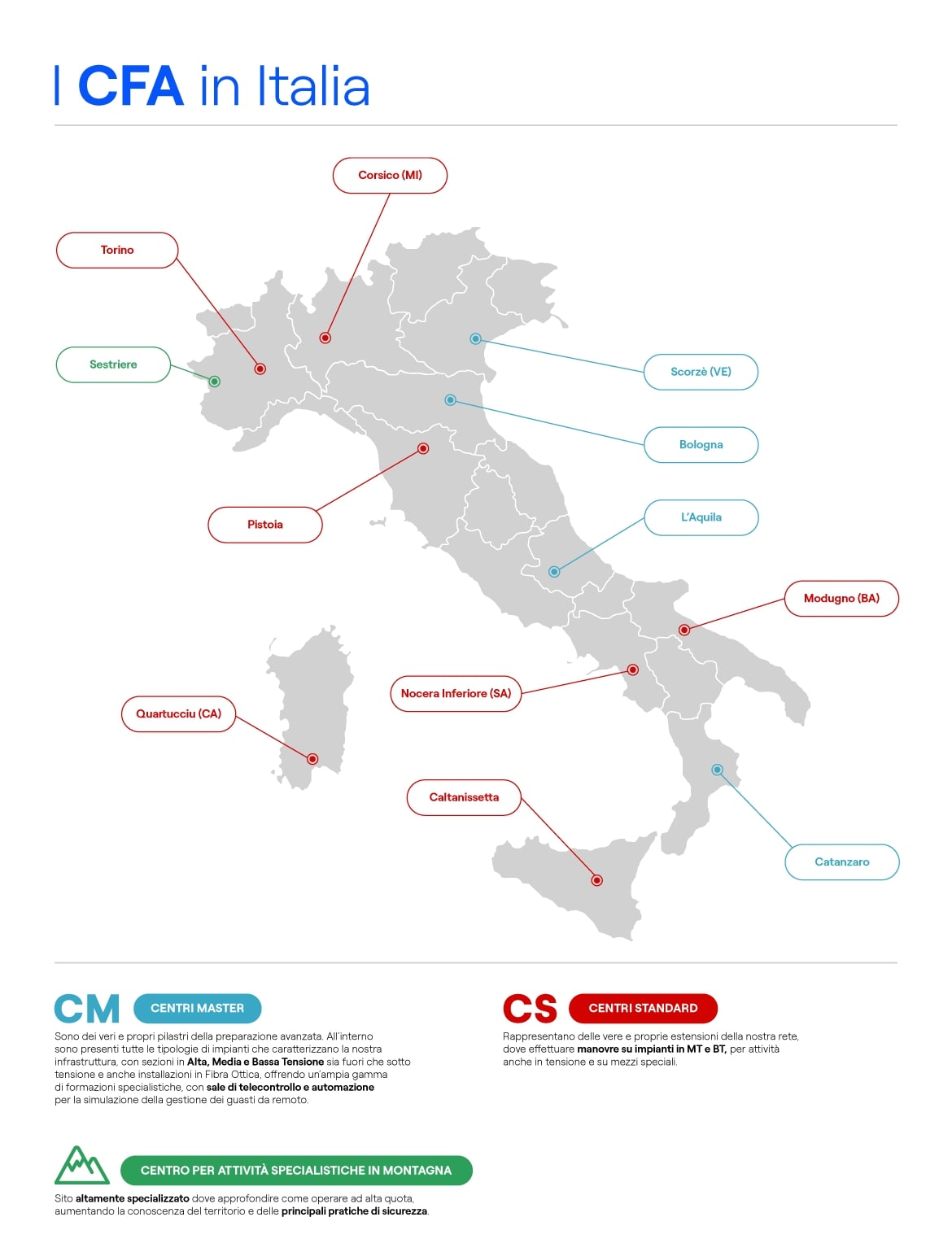 Dislocate su tutto il territorio nazionale, queste 12 strutture ospitano sessioni che spaziano dalla teoria alla pratica e sono dotate di infrastrutture elettriche corrispondenti alle tipologie di impianti presenti sul territorio, consentendo di simulare in sicurezza le diverse attività e interventi sulla rete in un contesto sicuro e protetto e con docenti e tutor qualificati.