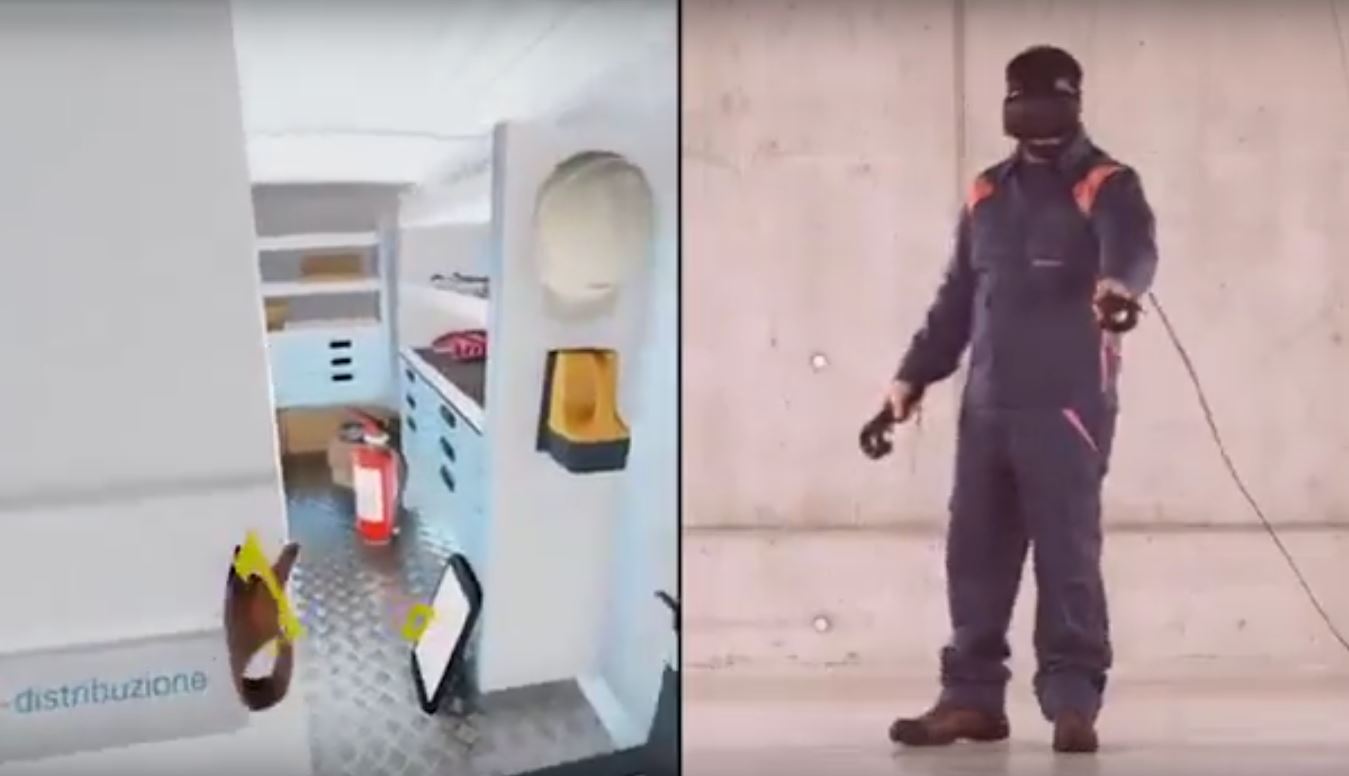 Il video mostra i movimenti che l'operaio esegue in tutta sicurezza in una stanza del centro di addestramento mentre è completamente immerso nel mondo virtuale che visualizza tramite i suoi occhiali.