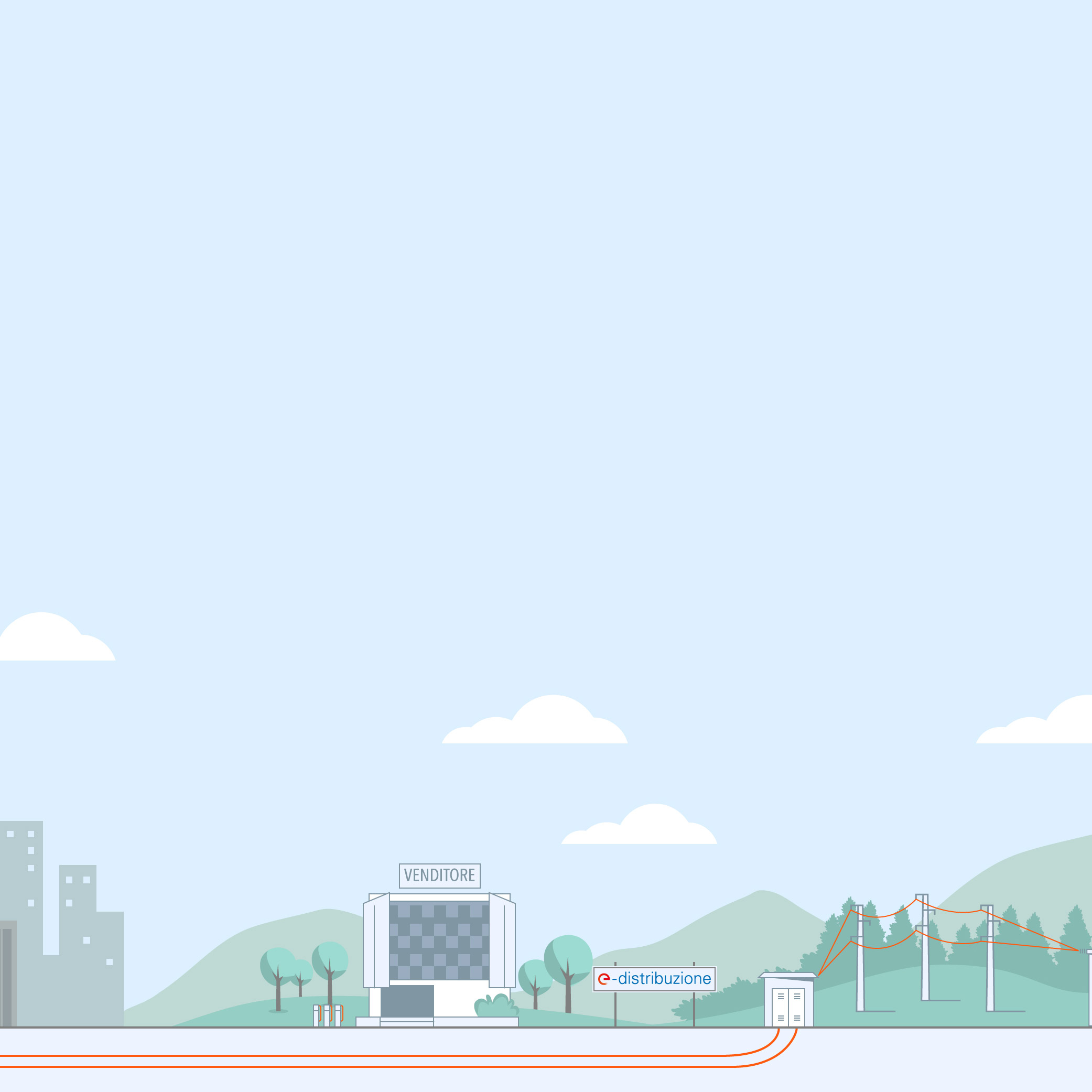 A noi, che siamo il Distributore, l’energia arriva da Terna S.p.A.: la società di trasmissione italiana che si occupa di far viaggiare l’elettricità su lunghe distanze, dalle centrali che la producono, alle nostre cabine di trasformazione.